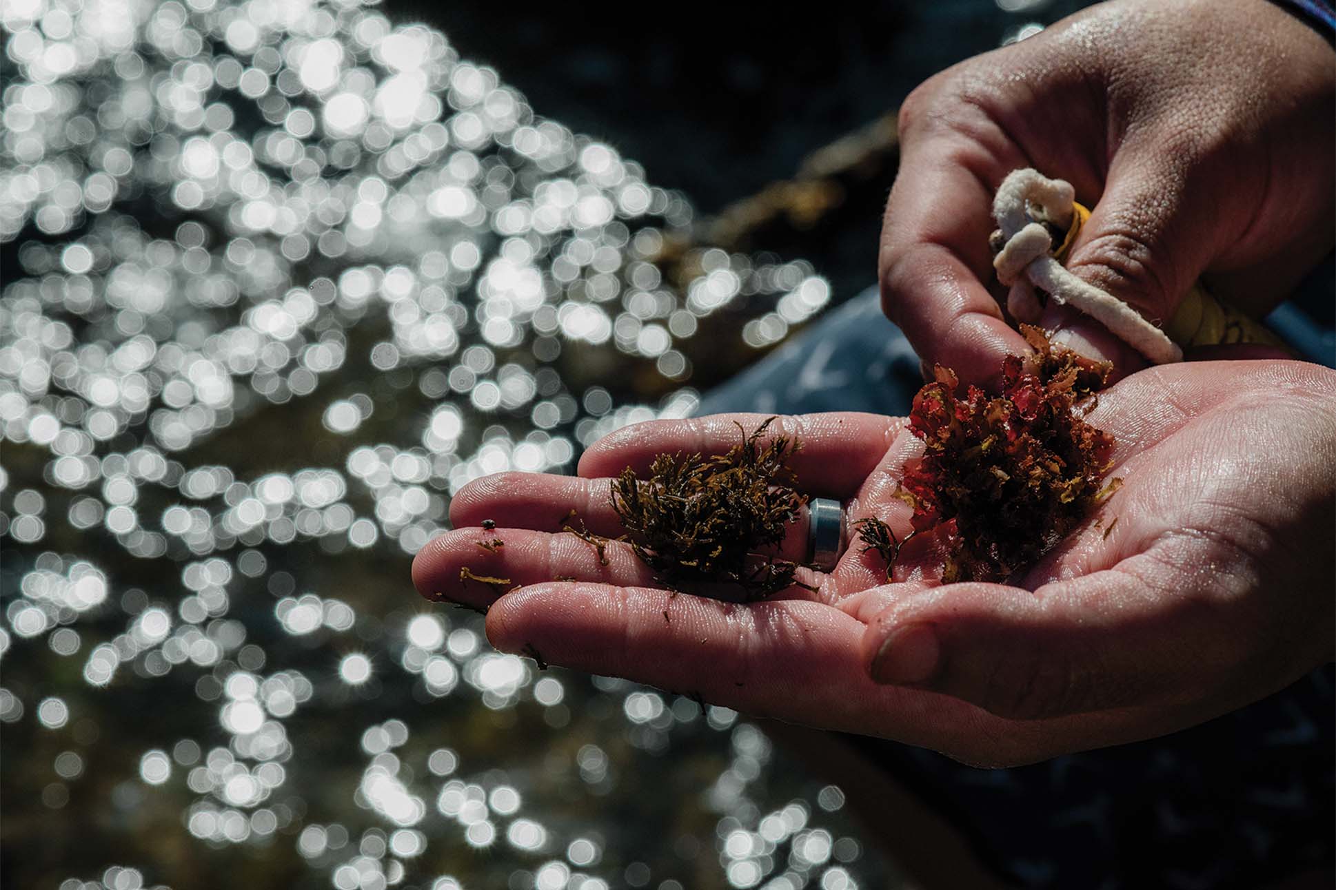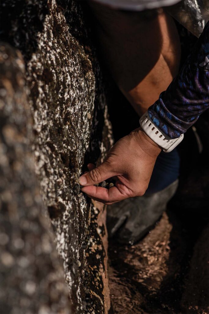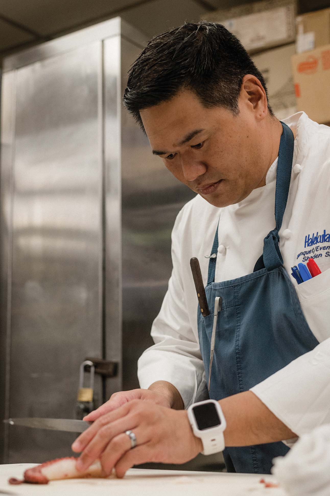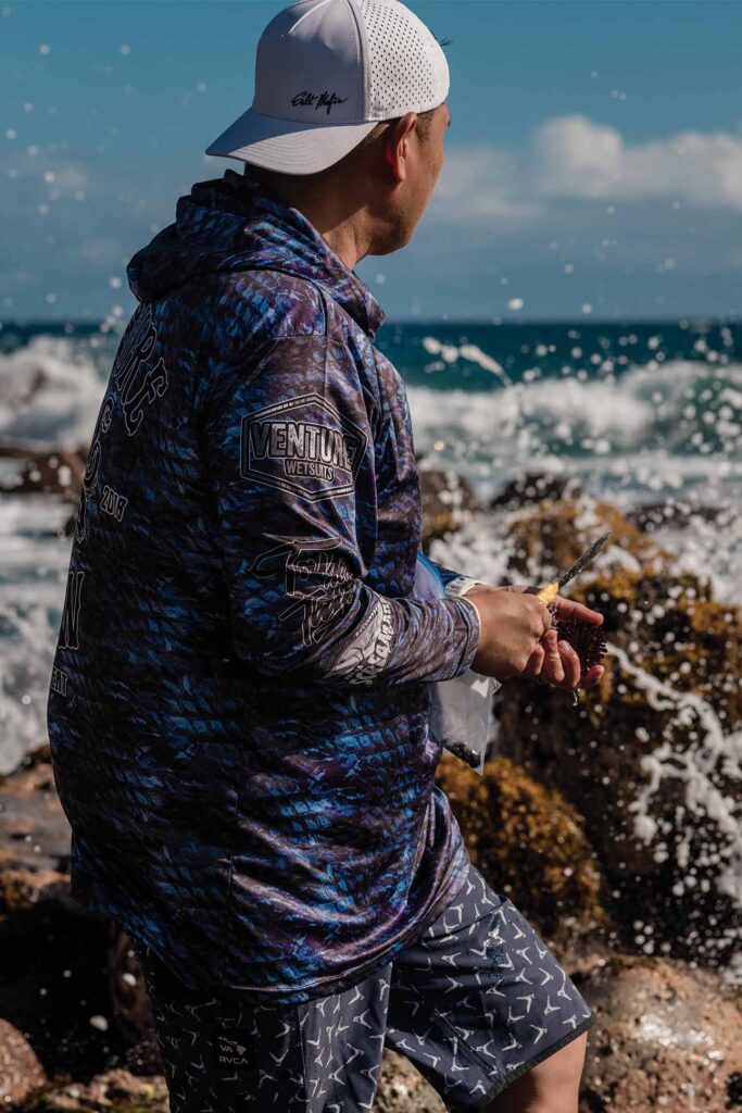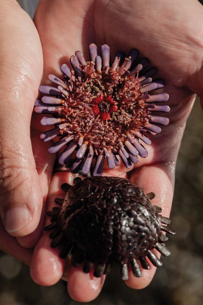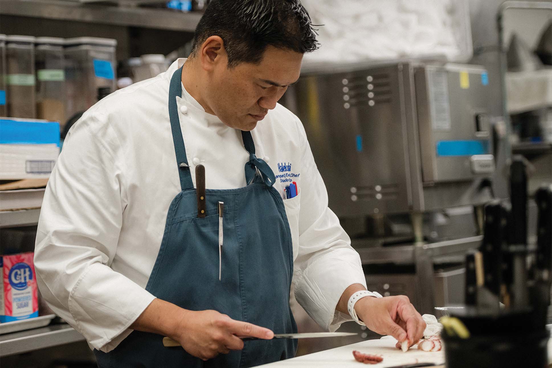 Inspiration often finds chef Shaden Sato on the shoreline. On at least one occasion, it took hold in the open water, when he was eye to eye with an octopus. “It’s like a giant ball of muscle,” Sato says, recalling the firm grip of limbs coiled around his arm while he captured the octopus freediving on the south shore of O‘ahu. Wrestling with it in the churning waves, “I swallowed two big gulps of salt water. That’s how I got the idea to create something with a really salty, oceanic taste.”