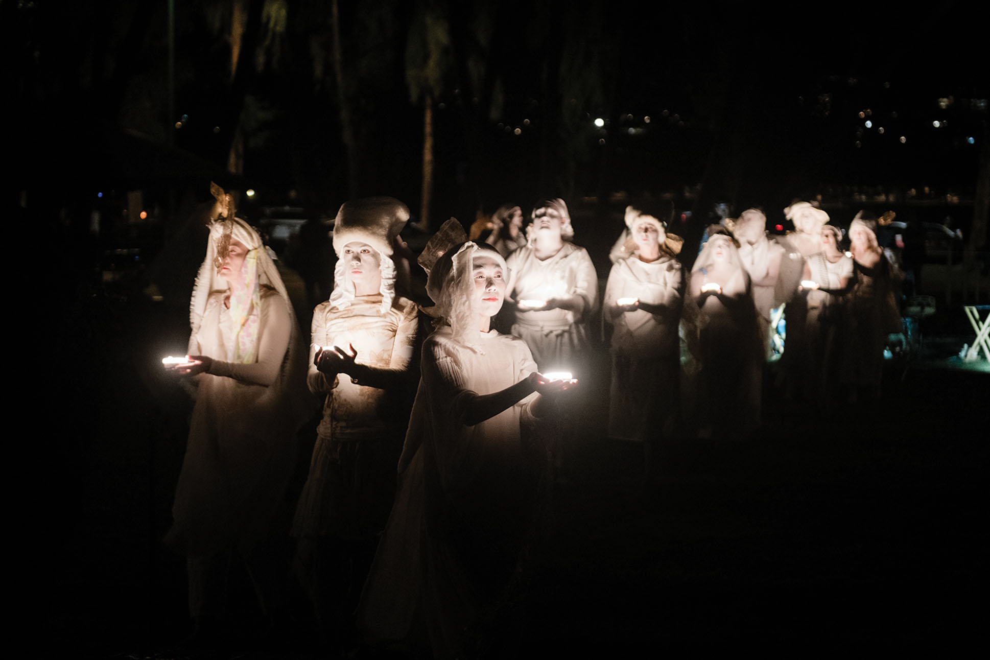 In a field along Kaimana Beach, figures draped in white glide through the expectant crowd. As dusk falls, the darkness presses in, save for the candlelight illuminating the dancers’ faces. A taiko drummer metes out a beat, growing frenetic as the dancers’ movements intensify. The performance, like much of butoh, resists easy description. All I can offer is the feeling it left behind: sorrow, awe, solemnity.