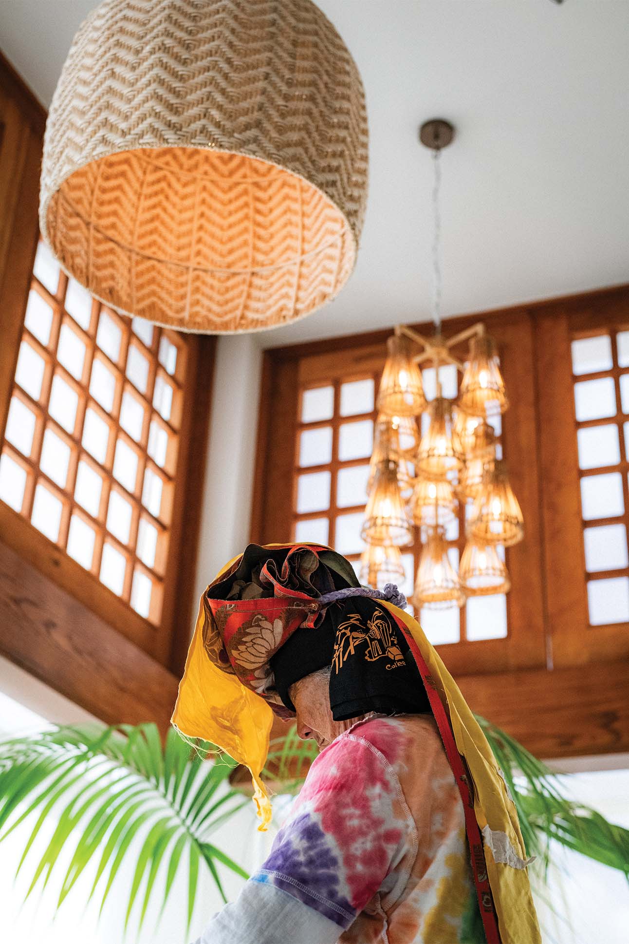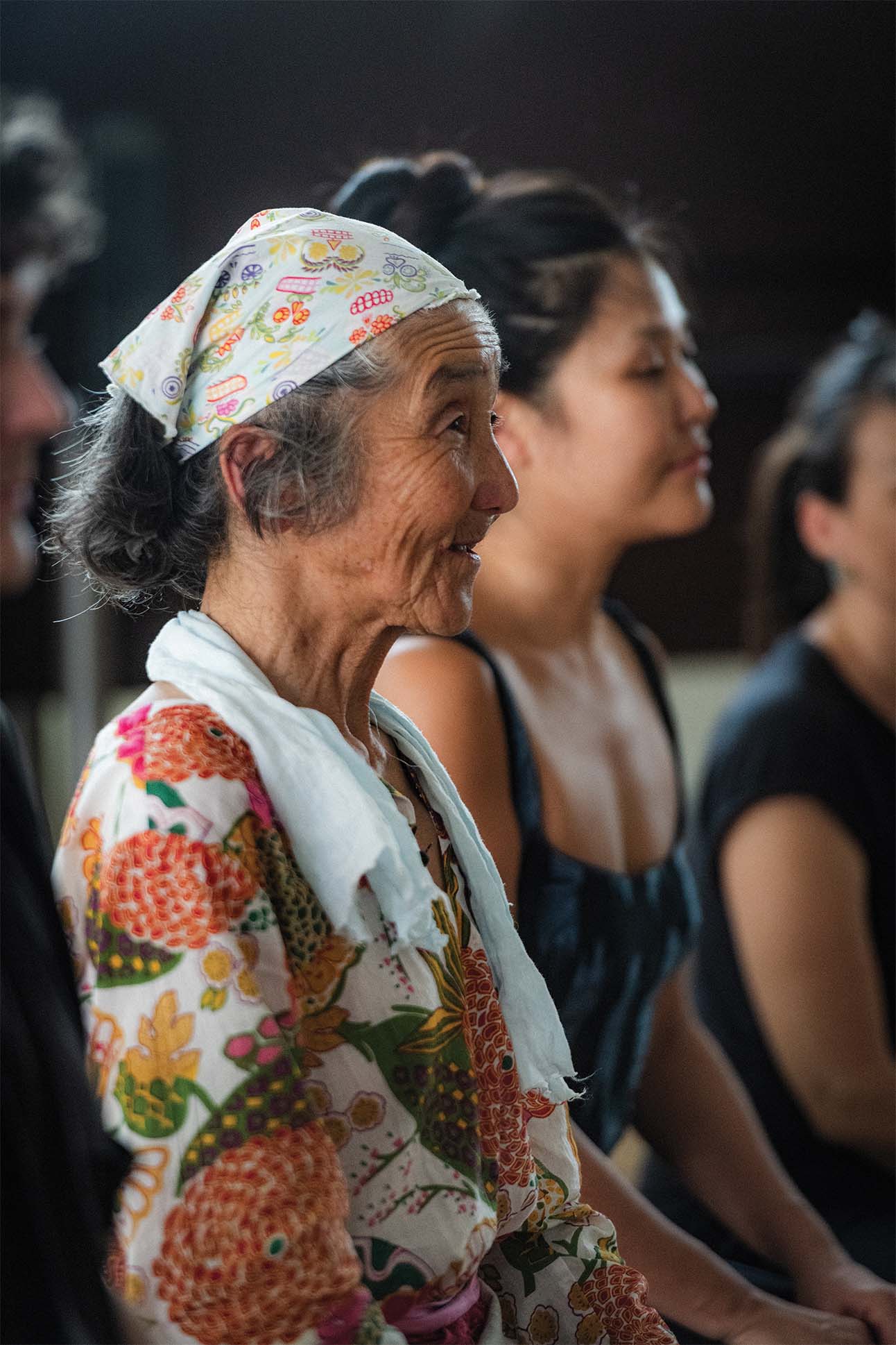 A single, sharp clap breaks the reverie. I’m no longer a flower—just someone in a high school gymnasium. Others around me, some two dozen or so, emerge from their own trance. At the front of the gym stands Hiroko Tamano, her petite frame clad in bright pink tights and a wagara-print top. A bandana holds her gray bob back from a weathered face. Despite her age, the 73-year-old butoh master still carries an undeniable presence, and the whole room hangs on her every movement.