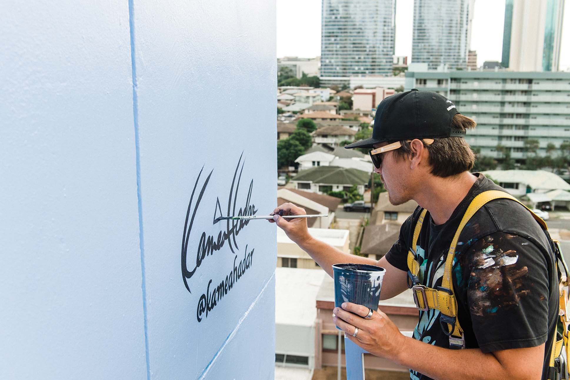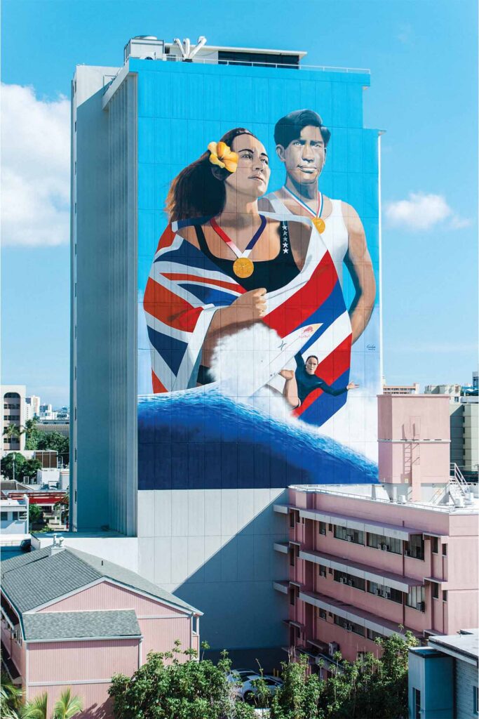 アーティストであり、現在「ワールドワイド ウォールズ」として知られるパブリックアート団体の元ディレクターでもあるカメア・ハダー氏の手にかかれば、ホノルルの街は生きるキャンバスとなる。2025年に完成したアイエアの低所得者向け住宅プロジェクト、ナウル タワーの25階建ての外壁に大きく羽ばたくイワ鳥の巨大な壁画や、2020年夏季オリンピックでカリッサ・ムーア選手がサーフィン競技の初代金メダルを獲得した翌年に描かれた、若き日のデューク・カハナモク氏と並ぶムーア選手の巨大な肖像画も手がけている。ハダー氏の壁画は、 この街で展開される物語を映し出し、街並みに色だけでなく、確かなアイデンティティを与えている。