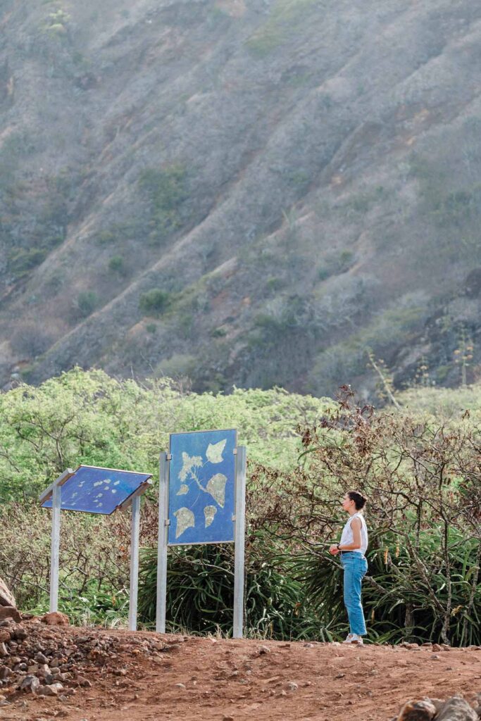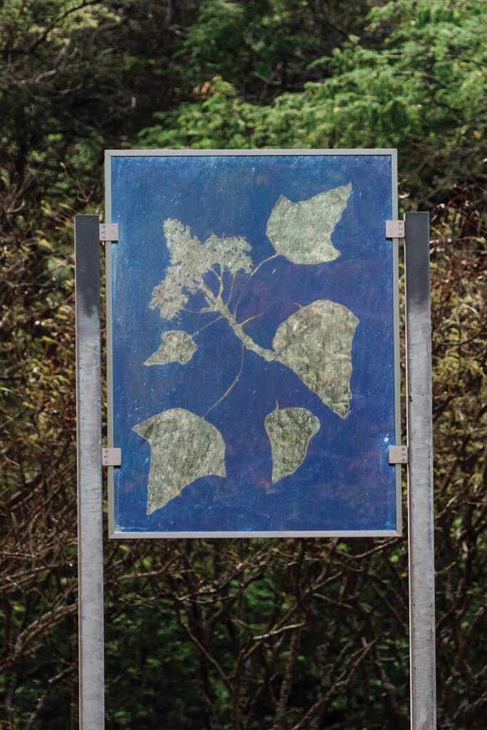 こうした流れの先にあるのが、2025年に始まった三年間のパブリックアートプロジェクト「ワヒ パナ:物語ある場所」である。オアフ島各地に、場所に根差した作品を設置していく試みだ。ネイティブハワイアンやハワイ在住のアーティスト、語り手、地域コミュニティが一堂に会するこのプロジェクトは、土地に刻まれた複雑な歴史に敬意を払いながら、多様な表現を通して場所と人との対話を生み出している。コリー・カメハナオカラ・ホルト・タウム氏の「カ パウ エフエフ オ ヒイアカ (ヒイアカの舞うスカート)」では、3台の市営バスが動くアート作品へと変貌する。バスの外装には流れるようなパウの模様が描かれ、インタラクティブなQRコードを通じて、乗客はヒイアカイカポリオペレの伝説に触れることができる。また、ココ クレーター植物園に設置されたウアラニ・デイヴィス氏のサイアノタイプ作品は、庭園を抵抗と再生の場として捉え直し、パオアカラニやウルハイマラマにあったリリウオカラニ女王の庭園の精神を呼び起こす。
