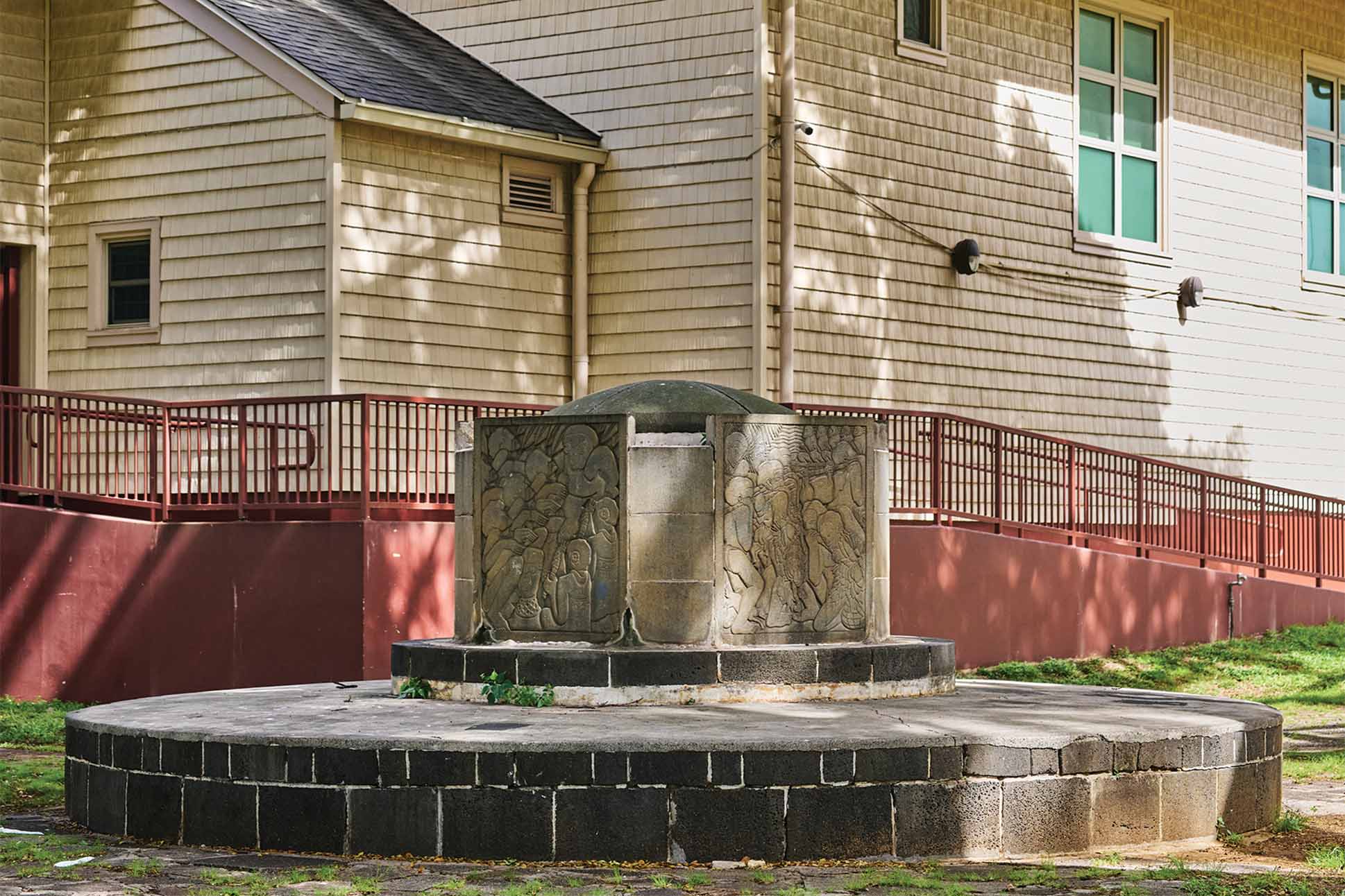 ハワイの図書館は、実はパブリックアートの宝庫でありながら、見過ごされがちな存在でもある。しかし、少し意識して周囲を見渡せば、芸術は日常の風景の中にさりげなく織り込まれていることに気づくだろう。プリンス デイヴィッド カヴァナナコア中学校近くの カヴァナナコア遊園地では、彫刻家マルグリット・ブレイジンゲイム氏による十角形の噴水に、ハワイ先住民の文化的営みがレリーフとして刻まれている。ここで遊ぶ子どもたちの記憶にも、かつて私の中に焼きついたヒー氏の壁画のように、意味として理解されるよりも先に、物語としてこのイメージが刻まれていくのかもしれない。