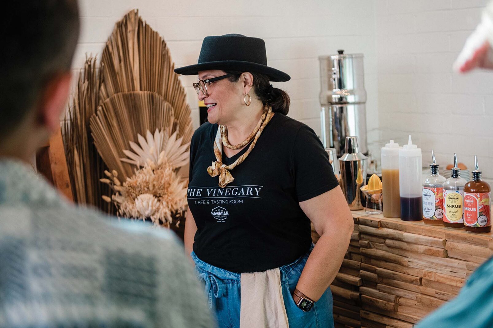 Poni Askew welcomes visitors at Hawaiian Vinegar Company’s storefront and tasting room, The Vinegary.